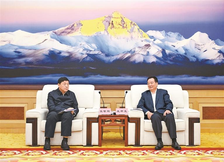 王君正代表自治区党委、政府,对张智刚一行表示欢迎,对国家电网长期以来给予西藏工作的大力支持表示感谢。他说,西藏是重要的国家生态安全屏障、战略资源储备基地、清洁能源基地,在党和国家工作大局中具有十分重要的战略地位。近期习近平总书记在西藏视察工作时,对从实际出发推动高质量发展、因地制宜发展特色农牧业和清洁能源产业等作出明确指示,为我们做好工作指明了前进方向、提供了根本遵循。国家电网关系国计民生、服务千家万户。长期以来,国家电网自觉把西藏工作置于党和国家工作大局谋划推进,积极履行政治责任、经济责任、社会责任,先后在西藏建成青藏、川藏、藏中、阿里四条“电力天路”,大电网覆盖西藏74个县区,为西藏长治久安和高质量发展作出了积极贡献。
