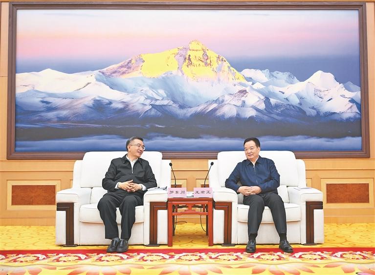 罗东川代表青海省委、省政府和省委书记吴晓军,向西藏自治区长期以来给予青海的帮助支持表示感谢,对西藏自治区经济社会发展取得的辉煌成就表示钦佩。他说,青海与西藏友好往来源远流长,交流合作卓有成效。我们要深入学习贯彻习近平总书记出席西藏自治区成立60周年庆祝活动期间发表的重要讲话精神,学习借鉴西藏推动经济社会高质量发展的好经验、好做法、好作风,积极融入和服务国家重大战略、重大工程建设,聚焦发展新质生产力、国家公园建设、生态环境协同治理、清洁能源产业、区域协调发展、交通运输互联互通、产业协作优势互补、加强各民族交往交流交融等方面,进一步深化务实合作,在以中国式现代化全面推进强国建设、民族复兴伟业道路上携手并进。