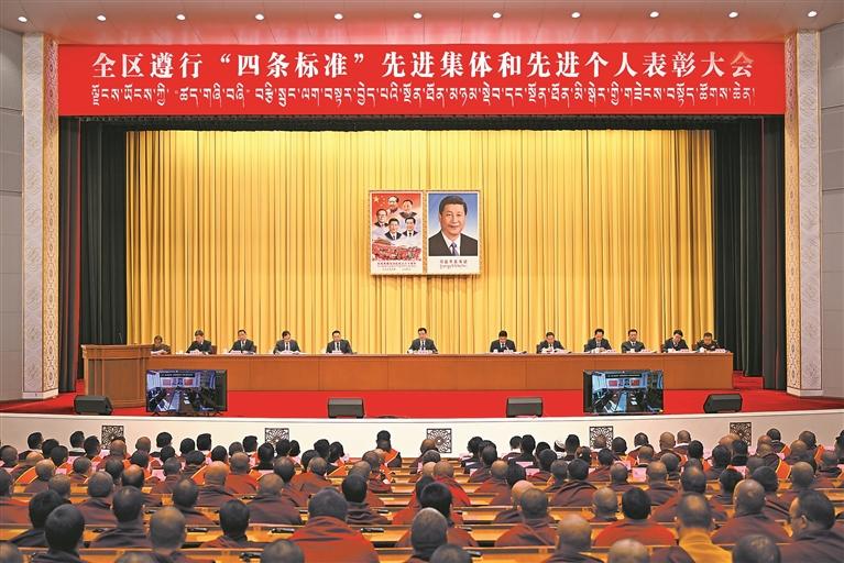 本报拉萨12月4日讯(记者 张尚华 刘文涛)12月4日,全区遵行“四条标准”先进集体和先进个人表彰大会在拉萨举行。自治区党委书记王君正出席并讲话,强调要深入学习贯彻党的二十届四中全会精神,贯彻落实习近平总书记关于宗教工作、西藏工作的重要指示和新时代党的治藏方略,贯彻落实习近平总书记视察西藏时的重要讲话精神,按照自治区党委十届九次全会部署要求,突出分类指导,强化典型引领,积极推进藏传佛教中国化,努力为建设社会主义现代化新西藏凝聚力量。